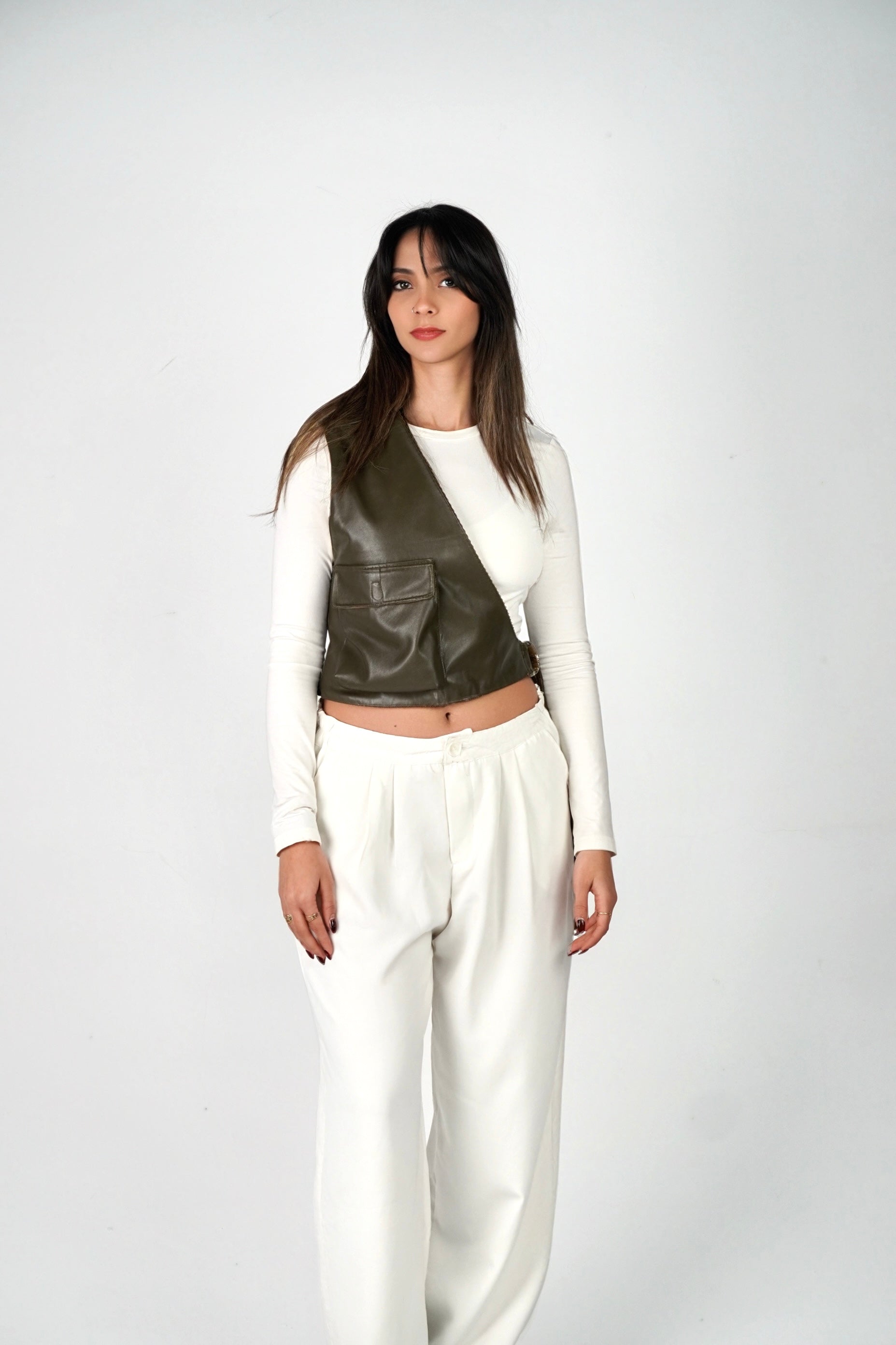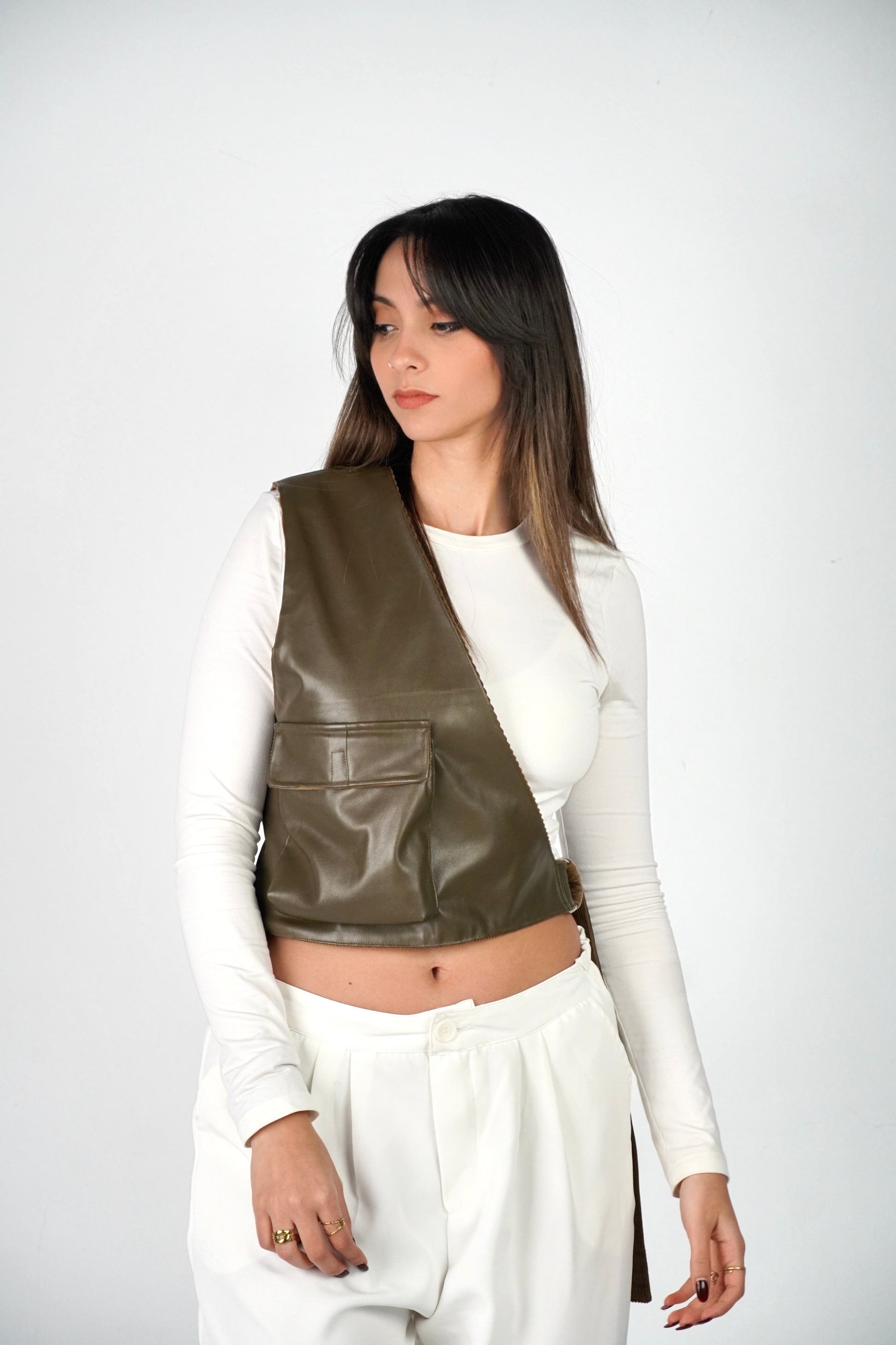 Crafted in leather on the outside and soft suede on the inside, this piece wraps around one arm only, creating an asymmetric silhouette that feels both bold and effortless.